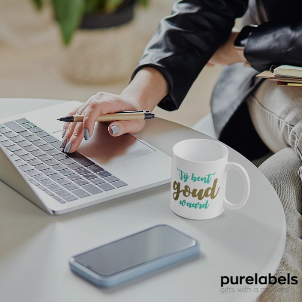 Soms zegt één zinnetje alles. Deze witte keramieken mok (330 ml) met de tekst “Jij bent goud waard” is een waardevol cadeautje voor personeel dat dag in dag uit het verschil maakt. Een oprecht compliment, tastbaar gemaakt voor bij de koffie of thee.
