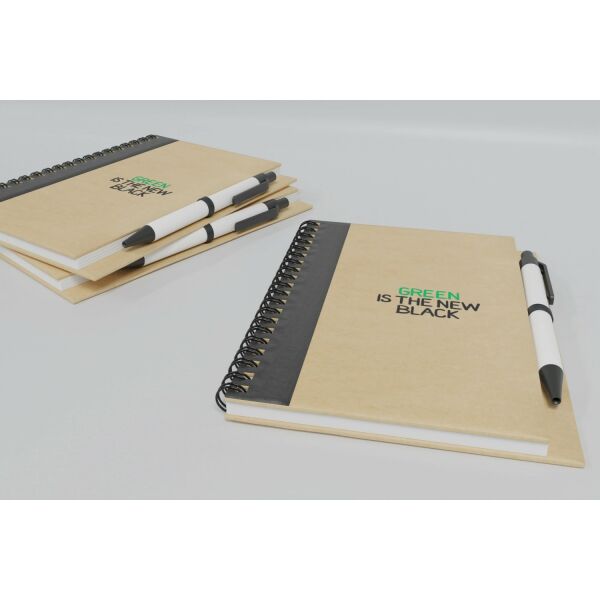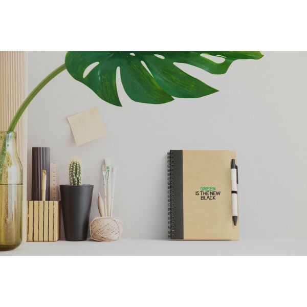 Notitieboek met omslag van gerecycled papier met 60 vellen gerecycled lijntjespapier en bijpassende pen. Notitieboek en pen samen verpakt.
