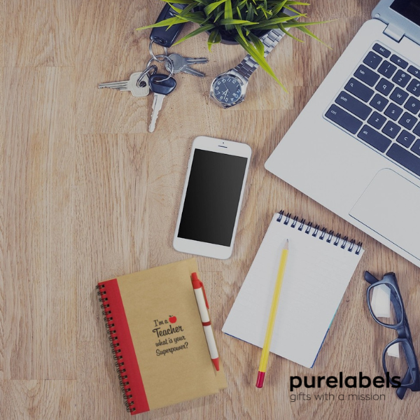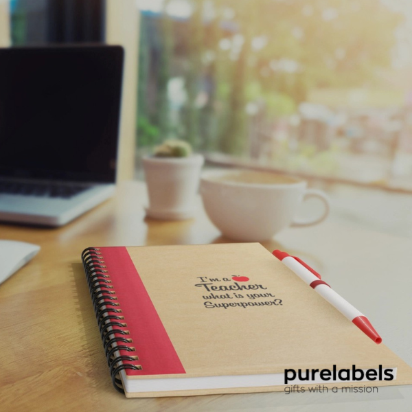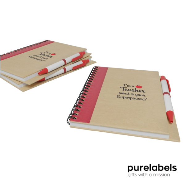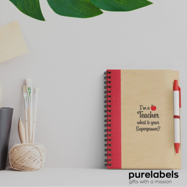 Met de tekst “I'm a teacher – what is your superpower?” is dit notitieboekje een knipoog én een compliment in één. Ideaal voor aantekeningen, to-do’s of inspirerende ingevingen. Gemaakt van gerecycled papier en geleverd met bijpassende pen – samen verpakt in één stijlvol en praktisch cadeausetje. Liever een eigen tekst of je logo erop? Dat kan al vanaf 50 stuks. Een persoonlijk en bruikbaar cadeau voor de Dag van de Leraar – mét blijvende impact.